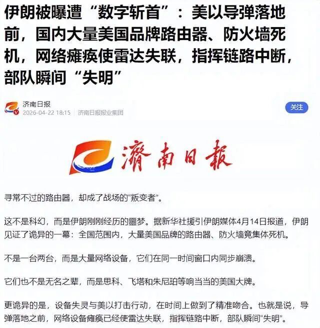 据央视新闻援引伊朗媒体4月14日报道,伊朗见证了诡异的一幕:全国范围内,大量美国品牌的路由器、防火墙竟集体死机。大量网络设备在同一时间窗口内同步崩溃。